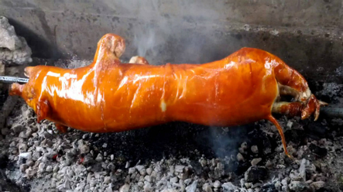 Giống heo Măng Đen của dân tộc bản địa. Heo được nuôi bằng thức ăn tự nhiên của núi rừng nên thịt săn chắc và rất bổ dưỡng. Con to nhất lúc trưởng thành cũng chưa đầy 20 kg. Heo được làm sạch lông, mổ lấy nội tạng; sau đó tẩm ướp gia vị là các loại nguyên liệu từ núi rừng Măng Đen. Heo quay nguyên con bằng lửa than cho đến khi căng da vàng, giòn rụm, tỏa mùi thơm phưng phức.