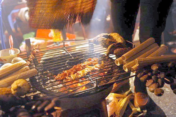 Mùa này, khi chiều buông, tiết trời càng trở nên lạnh lẽo, chỉ vào khoảng 13, đến 16 độ, thậm chí khi màn đêm buông nhiệt độ còn xuống thấp hơn nữa, vì vậy các quán đồ nướng bình dân trên vỉa hè ở đây luôn là tụ điểm níu chân du khách tới thưởng thức và tán gẫu. Ngồi quây quần xung quanh chậu than hoa đỏ lửa, ít nhiều du khách cũng cảm nhận được sự ấm cúng lan tỏa, và ai muốn ăn món nướng gì thì ngay tức khắc được chủ quán đáp ứng liền bằng hình thức đợi chờ và xem… “truyền hình trực tiếp”- nghĩa là xem người ta nướng trước mắt mình. Tôi đảm bảo rằng, khi xem chủ quán nướng đồ hầu như ai cũng nao lòng thèm muốn ăn ngay bởi sức hấp dẫn từ mùi thơm sản vật tỏa ngát hương.