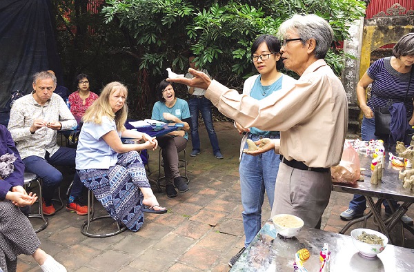 Khách du lịch nước ngoài trải nghiệm, tìm hiểu nghề làm phỗng đất tại gia đình ông Phùng Đình Giáp ở thôn Đông Khê, xã Song Hồ (Thuận Thành). Ảnh tư liệu.