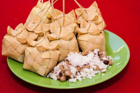 Tất cả đã sẵn sàng, nếp đã xào được xếp vào lòng lá, đặt viên nhưn đậu xanh hoặc một khúc chuối xiêm chín vào giữa, phủ kín lớp nếp lên trên, ấn cho dẽ dặt và kết chặt nắp lại (nếu bánh gói hình vuông) hoặc gói kín (nếu bánh hình chóp nón tam giác). Bánh hình vuông kết sao cho bốn góc vuông vắn. Rồi cột bánh lại bằng dây thốt nốt, dây lác hoặc dây ni-lông. Sau cùng, bánh được buộc thành chùm 10 cái, cho vô xửng hấp khoảng 2 giờ đồng hồ thì chín.