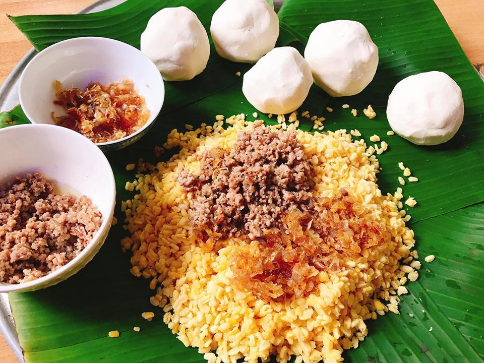 Khâu quan trọng không kém là nhân bánh. Với nhân ngọt, đỗ xanh ngâm nước nóng sau đó đãi sạch vỏ, cho lên nấu cơm đỗ, dùng thìa miết vụn cơm đỗ, nêm chút đường, nắm thành những nắm nhỏ cùng lạc rang, vừng, dừa,… Nhân mặn gồm thịt băm nhuyễn cùng hành khô và mộc nhĩ, cho lên bếp xào qua với 1 chút dầu ăn và nêm 1 chút gia vị.