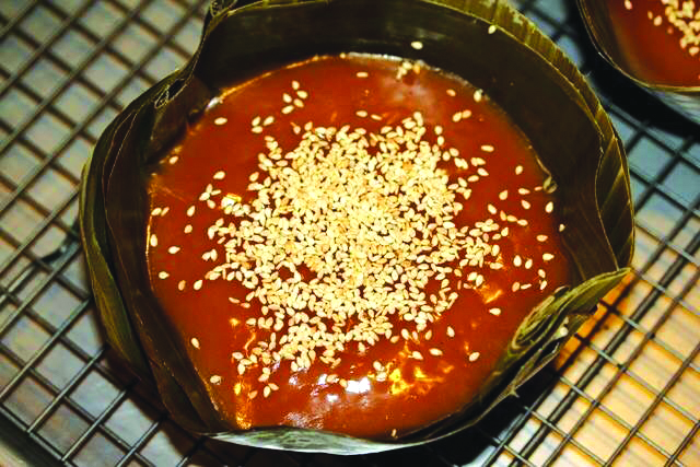 rắc lạc, vừng rang lên mặt bánh và thêm một lớp lá chuối khác, cuối