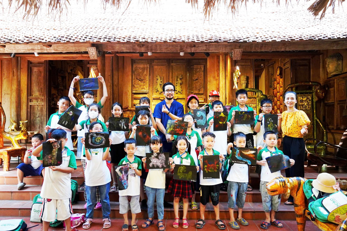 Nghệ nhân Nguyễn Tấn Phát giới thiệu về văn hóa xứ Đoài, không gian làng cổ Đường Lâm và giá trị của văn hóa dân gian truyền thống tới các em nhỏ.