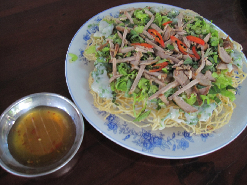 Bên cạnh nem nướng, bánh xèo, bánh tét lá cẩm, du khách còn có thể thử món pizza hủ tiếu ăn kèm nước mắm chua cay.