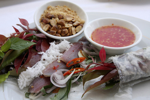 Nguyên đĩa cá sống có thể khiến nhiều người e ngại nhưng cứ mạnh dạn thử cuốn bánh tráng với rau, dừa nạo, cá trích, chấm mắm đặc biệt sẽ thay đổi ngay suy nghĩ.
