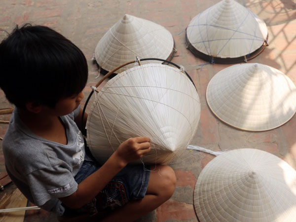 Trẻ em ở Phú Châu từ 6 tuổi đã biết làm các công đoạn đơn giản khi làm nón như cạp vanh, khâu chỉ….