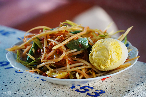 Đu đủ đâm không được phục vụ kèm nước chấm như các loại gỏi thông thường, bởi mọi gia vị đã hòa quyện trong lúc đâm. Bạn có thể gọi thêm trứng vịt dữa để ăn kèm thì thật là thú vị./.