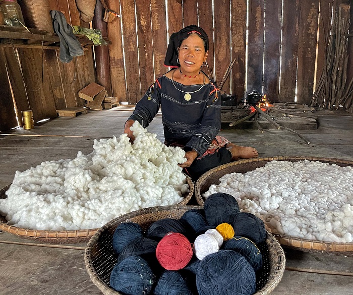 Những tri thức cổ truyền của nghề dệt như trồng bông, kéo sợi, nhuộm màu, dệt vải được nữ nghệ nhân Đinh Thị Lăm (làng Kgiang, xã Kông Lơng Khơng, huyện Kbang) gìn giữ, sáng tạo qua bao thử thách thời gian. Ảnh: Hoàng Ngọc