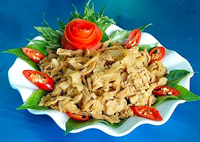 Loại thịt này cứ để nguyên miếng rồi nướng cho chín se các mặt cắt trên than hồng, sau đó ép bỏ nước rồi pha khổ nhỏ con bài, thái mỏng ướp với nước mắm, bột ngọt, thính.