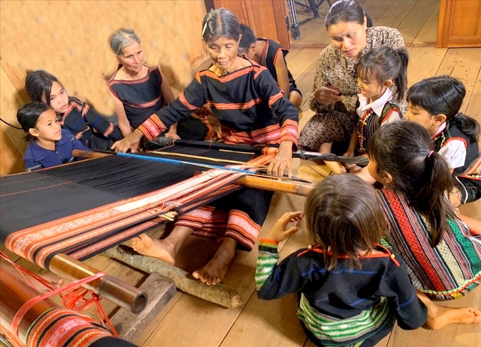 Bà Rơ Châm Mir (69 tuổi), thành viên Câu lạc bộ (CLB) dệt thổ cẩm gắn với du lịch cộng đồng Ia Mơ Nông ngồi bên khung cửi hướng dẫn cho mấy đứa trẻ Gia Rai cách dệt thổ cẩm, thỉnh thoảng bà lại xoa đầu khen các cháu học nhanh, làm giỏi quá!