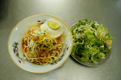 Món này ăn kèm rau sống. Có tới 9 loại rau ăn kèm khác nhau như bắp chuối, rau muống chẻ, giá, cải cay… Khi ăn, bạn chỉ cần trộn đều để phần nước thấm vào từng sợi mì là được.