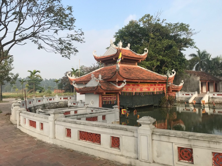 Nằm dưới bờ đê sông Cà Lồ, con đường mòn nhỏ đầy bùn đất dẫn chúng tôi vào làng ngày nào giờ đây đã được lát bê tông phẳng mịn. Đặt chân đến đầu làng, thu hút ánh nhìn của chúng tôi là một ngôi chùa nhỏ, cổ kính và bên cạnh là một thủy đình – sân khấu của những tiết mục múa rối. Thủy đình là một ngôi nhà nổi trên mặt ao, có thiết kế mái cong hình rồng, lớp ngói đã ngả sang màu đỏ sẫm qua những tháng năm với bao lần thấm tháp gió sương, đậm sắc màu cổ truyền. Trước mặt thủy đình là bức màn cói xanh biếc hệt như màu của mặt nước ao, và đằng sau chiếc màn che ấy là nơi các nghệ nhân “hóa thân”, điều khiển những chú rối “xung trận”.