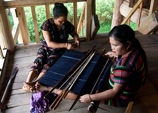 Pơling Muối đang truyền dạy kỹ thuật dệt cho một thợ trẻ. Ảnh: TẤN VỊNH