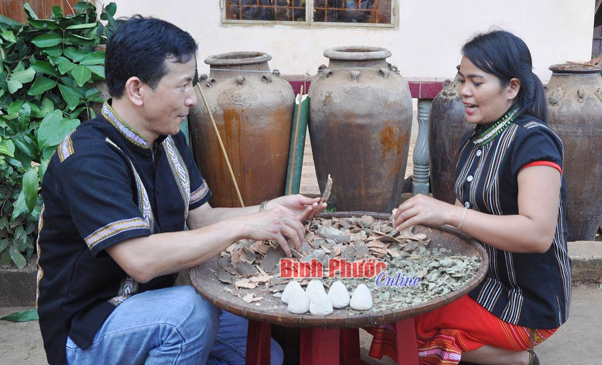 Tùy theo mong muốn, nhu cầu, đồng bào S’tiêng sẽ đi rừng hái lá về làm rượu. Đầu tiên, đồng bào sẽ vào rừng tìm vỏ cây hmuol, kraidang về thái nhỏ, phơi khô sau đó giã thành bột mịn. Gạo nếp ngâm nước cho mềm rồi giã nhuyễn. Muốn làm rượu ngọt sẽ đem bột gạo trộn đều với bột vỏ cây hmuol theo tỷ lệ 1 vỏ, 4 gạo. Chia bột này thành những viên nhỏ trong lòng bàn tay rồi đặt lên cái nia, ủ kín lá đặt trong nơi râm mát. Chị Xia cho biết, men phải được ủ trong bóng mát mới ngon và không bị bể. Sau khoảng 5 ngày ủ, các viên men lên nấm, phủ trắng đều xung quanh là đạt.