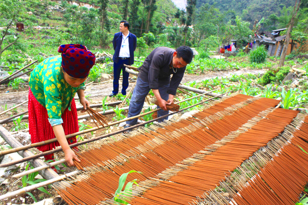 Nằm dưới những vách đá hiểm trở, làng nghề làm hương thôn Sín Thầu, xã Sảng Tủng (Đồng Văn) đã có từ trăm năm nay. Tuy là nghề phụ nhưng nhiều gia đình giữ nghề truyền thống vẫn cho họ một khoản thu nhập đáng kể.