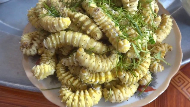 Món tằm ăn lá sắn Ấn Độ đã trở lại không ít bữa cơm gia đình ở thành phố Lào Cai, kể cả những gia đình khá giả. Xin nói thêm, tằm ăn lá sắn chế biến khá đơn giản. Sau khi trần qua nước sôi cho tằm nhả hết chất bẩn là có thể cho vào chảo, chiên giòn thành món đặc sản nhậu lai rai với bạn bè hoặc rang lẫn lá chanh cho tới khô quắt, làm món chính ăn cơm rất ngon.