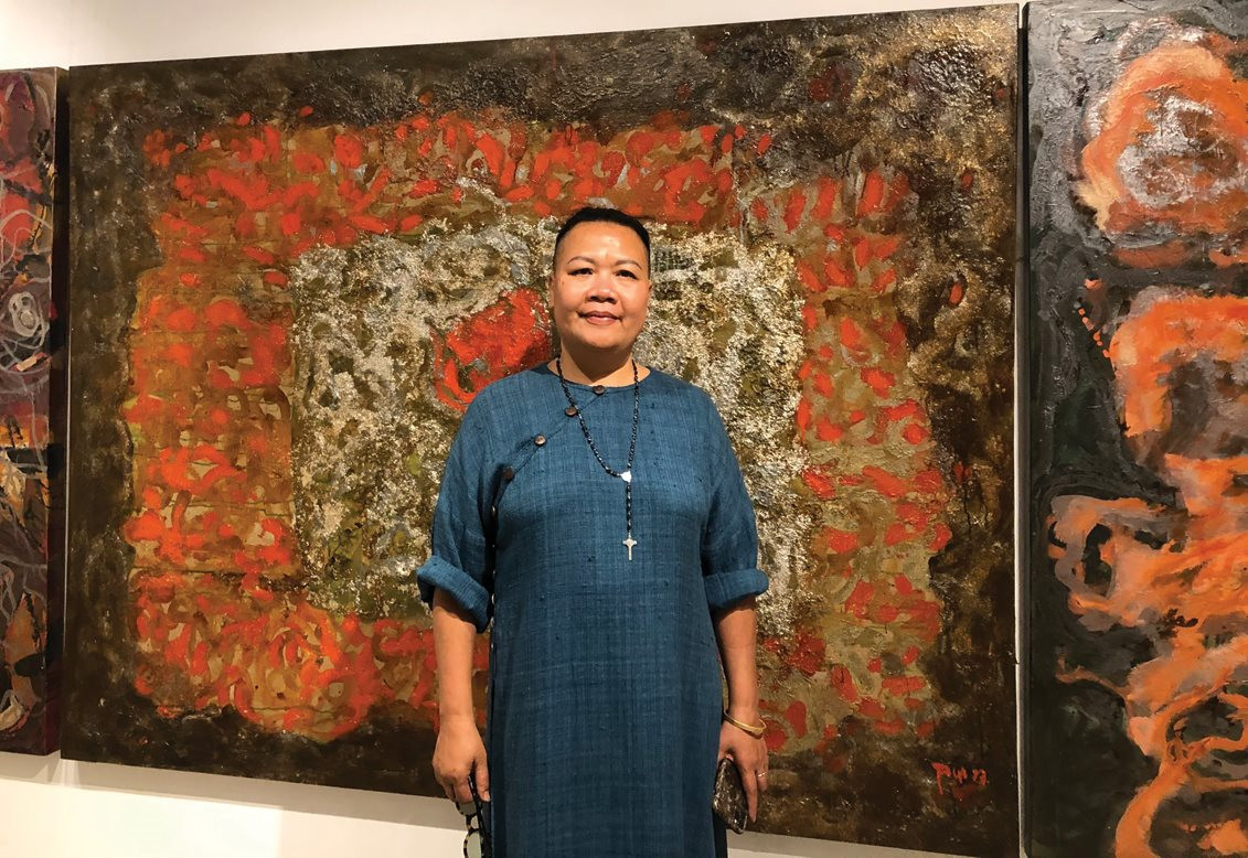 Họa sĩ Trần Thị Thu và tác phẩm vẽ trên giấy giang.