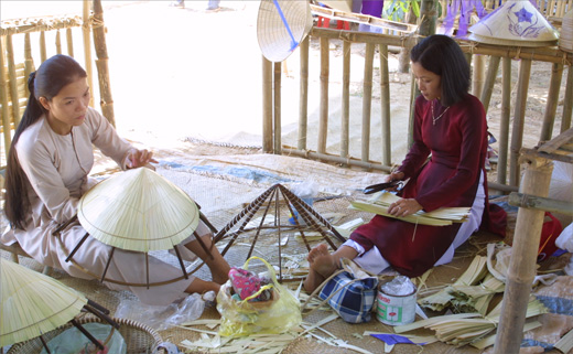 Nói đến sản phẩm đặc sắc của các làng nghề truyền thống ở Huế, có lẽ nón lá được nhiều người biết đến hơn cả. Hàng trăm năm nay, nón lá không chỉ là vật dụng thân thiết che nắng, che mưa gắn bó với đời sống hàng ngày của mỗi người dân Huế, mà hơn thế, nó đã trở thành một đặc sản văn hóa “nón bài thơ” gắn với hình tượng của người con gái Huế: <!—->