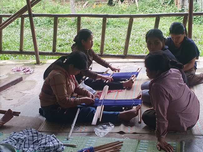 Các thành viên trong tổ dệt chỉ nhau cách tạo nên những sản phẩm thổ cẩm độc đáo