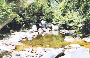 Trước khi đổ xuống vùng đồng bằng thuộc địa phận xã Suối Cát (nay thuộc xã Suối Tiên, huyện mới Cam Lâm), dòng suối gặp một đập đá thiên nhiên chắn ngang, rẽ ra làm hai nhánh, một nhánh chảy về hướng Bắc mang nước tưới cho cánh đồng màu mỡ, còn nhánh kia thì chảy tràn trên miền đá cứng, rẽ về hướng Đông đổ về địa phận xã Suối Dầu. Sau đó, cả hai nhánh như đã hẹn hò cùng nhập chung vào sông Cái, về đến Nha Trang và ra bể…<!—->