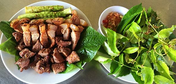 mặt thơm phưng phức. Thưởng thức trâu nướng kèm theo lá trơng và nước tương pha