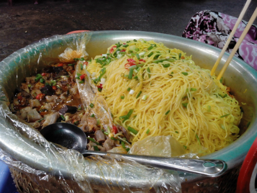 Đây là món ăn chỉ dành cho vua chúa ngày xưa. Không giống như bún hay phở, cao lầu giống như một món trộn hơn. Nguyên liệu chính làm nên món ăn này chính là sợi mì vàng hơi giống mì Quảng, thịt xá xíu, tai heo chiên giòn, rau thơm và một ít nước thịt xá xíu. Có thể thêm nước mắm tùy khẩu vị mặn nhạt.