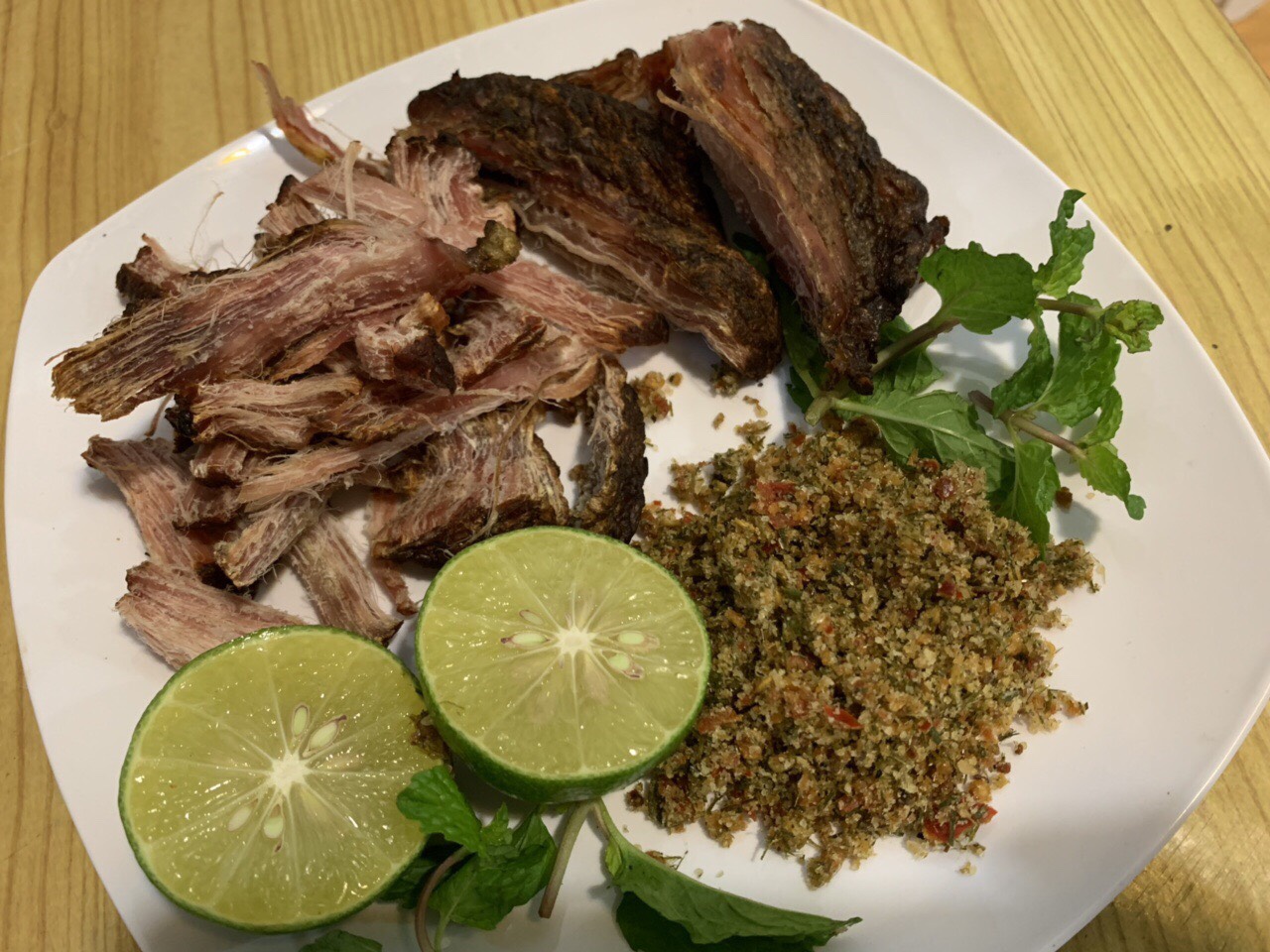 Khi nướng, miếng thịt khô được để nguyên miếng lớn. Lúc ăn sẽ xé nhỏ theo chiều thớ thịt. Nhìn bề ngoài, miếng thịt có vẻ khô cứng rám mùi khói nhưng khi xé ra, bên trong thịt vẫn còn giữ được độ ướt, mềm.