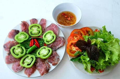 Nước chấm cũng được làm từ mắm lù pha thêm tỏi, ớt, chanh, mì chính cho ngon. Nhìn đĩa cá có vài lát cà chua xanh và ít rau thơm nằm trên lớp cá ngừ mỏng tang có màu nâu đỏ trông rất bắt mắt.