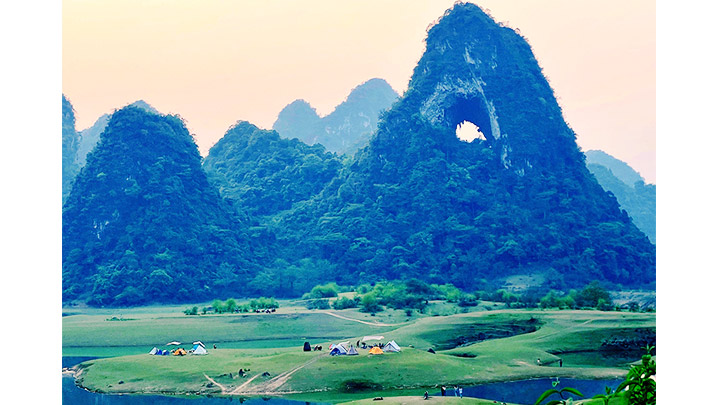 Vượt gần 300 km từ Hà Nội lên huyện biên giới Trà Lĩnh (Cao Bằng) để cắm trại ở một nơi gần như chưa có các dịch vụ du lịch, chúng tôi chỉ đơn giản muốn tìm về thiên nhiên, biết thêm một vùng đất lạ. Song, vẻ đẹp độc đáo của Núi Thủng và toàn bộ thung lũng xanh tươi bao quanh đã mang đến trải nghiệm còn hơn cả kỳ vọng.