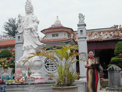 Tưởng nhớ công lao trời biển của bà, nhân dân đã tôn bà là Thành hoàng làng và lập đền thờ. Ngôi chùa ngự trên khu đất cao bằng phẳng, rộng hơn 2.000m², được xem là vị trí đắc địa “thăng long bí châu”, tức là ngự trên trán rồng. Ngôi chùa có 3 gian chính điện, hậu cung và ngai thờ pho tượng đồng nặng khoảng 40kg, ngoài ra còn có tư trang đồ thờ và những bức hoành phi khảm xà cừ.