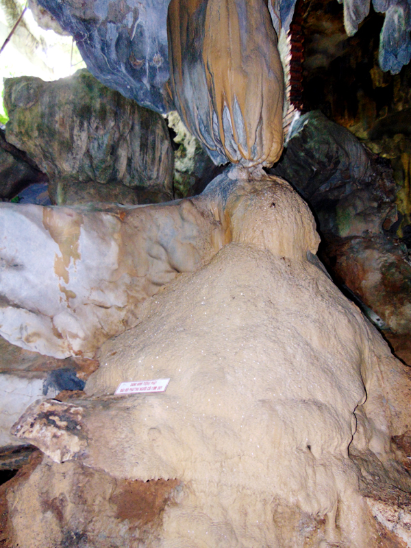 Thạch nhũ hình Phật Di Lặc ngồi trên lưng rùa, trên đầu là trái phật thủ trong động Đông Trong.