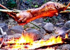 Heo quay chín thì đưa xuống và cắt thành những miếng nhỏ. Thịt heo tộc vốn dai và ít mỡ do chúng vận động nhiều, không ăn thức ăn tăng trọng nên ăn không ngán. Bên dòng thác nước xanh ngát, giữa đại ngàn rộng lớn mà thưởng thức món này thì còn gì bằng. Khách còn có dịp trải nghiệm tay nghề đầu bếp của mình với món heo tộc quay…/.