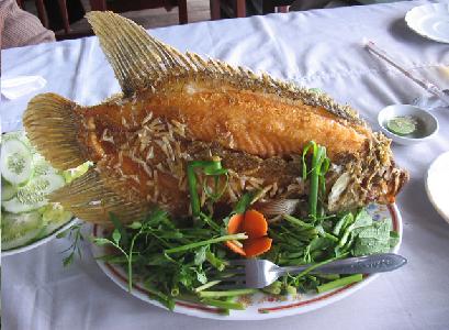 Trong cách phương thức chế biến cá tai tượng, có lẽ “tai tượng chiên xù” đã đem lại cho nền ẩm thực nơi đây một diện mạo mới. Con cá vàng ươm, vẹn nguyên hình hài được đặt trong chiếc đĩa hột xoàn xếp đầy rau xanh trông rất ngon lành.