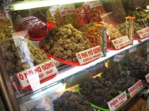 Cửa hàng ô mai Tiến Thịnh, số 21 Hàng Đường, vẫn giữ nguyên nếp nhà và cách bài trí theo kiểu cổ xưa mộc mạc. Trong tủ kính xếp hàng chục lọ ô mai và những món quà thuần Việt như chè, bánh khảo, bột sắn, bánh cốm.