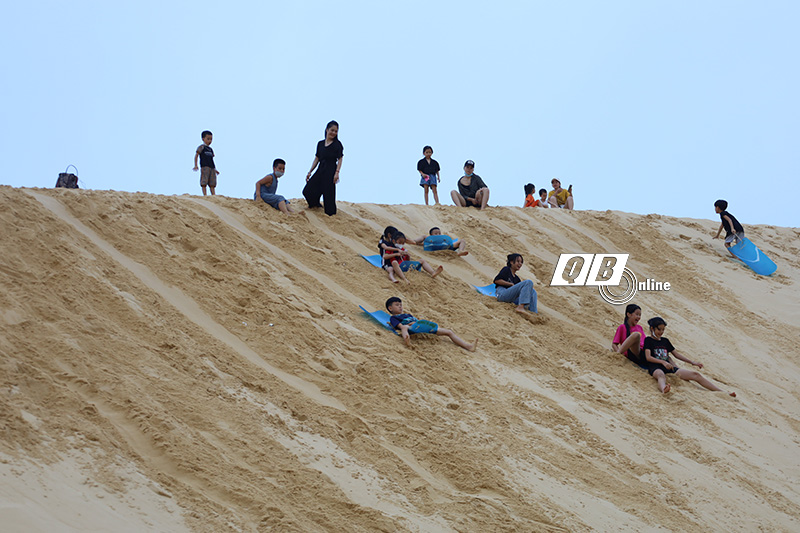 Chiều, đồi cát Quang Phú (TP. Đồng Hới) nắng chưa kịp dịu đã bắt đầu rộn ràng những bước chân lữ khách. Phần lớn trong số đó là du khách đến trải nghiệm các trò chơi trên cát sau khi tham gia chuyến city tour khám phá TP. Đồng Hới. Chỉ mất chừng 15 phút đi theo tuyến đường sát biển dài chừng 8km, du khách đã có thể đến được với đồi cát. Điểm làm nên sức hút cho nơi này là những đồi cát rộng mênh mông, màu cát trắng mịn, nối đuôi nhau trùng điệp. Trên đỉnh đồi cao nhất, du khách có thể phóng ánh nhìn ra xa, thu vào tầm mắt là mênh mông biển cả và những làng mạc bé nhỏ neo mình bên chân sóng.