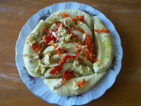 Tuy chỉ là một món ăn dân dã chốn đồng quê, nhưng dưa chuối đã để lại nổi nhớ da diết trong lòng những người con xứ Quảng xa quê mỗi khi nhớ về với những bông hoa chuối hồng tươi và những trái chuối non trong khu vườn quê yên tĩnh, thanh bình của mẹ năm nào.